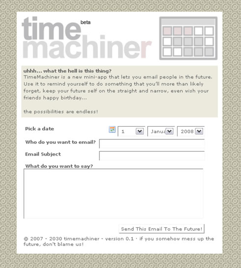 La idea de Time Machiner es bastante conocida, pero no esta mal tener siempre una de estas herramientas a mano. Con Time Machiner podemos programar el envió de un correo a futuro definiendo la fecha y el contenido del mismo.