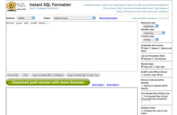 Great list! There is also a new free online SQL formatting tool – SQL formatter http://www.sql-format.com/ I really like that it has soo many options for customizing the output, really advise to try this one!